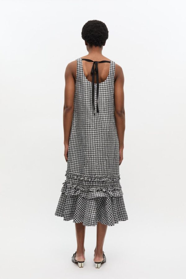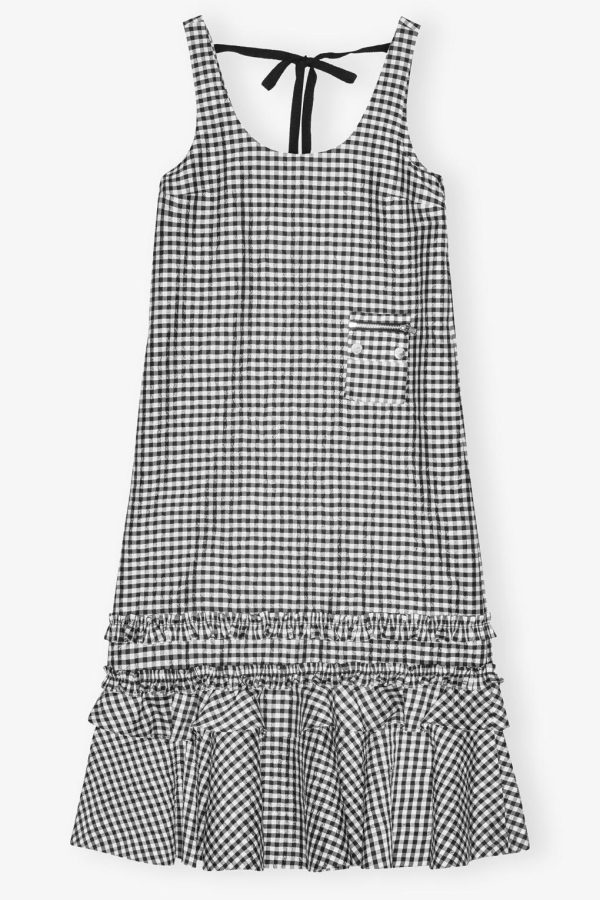 GANNI Black & White Check Long Dress | Recycled Polyester | U-Neck & Ruffled Hem