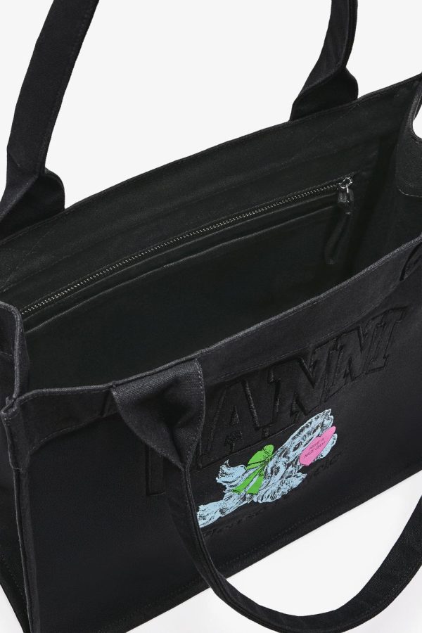 GANNI Phantom Black Puppy Large Tote Bag | Recycled Cotton Women’s Tote with ‘Have a Nice Day’ Graphic