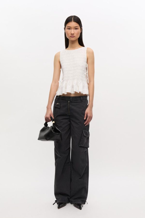 GANNI Women’s White Organic Cotton Smock Tie Top – Sleeveless with Ruffled Hem