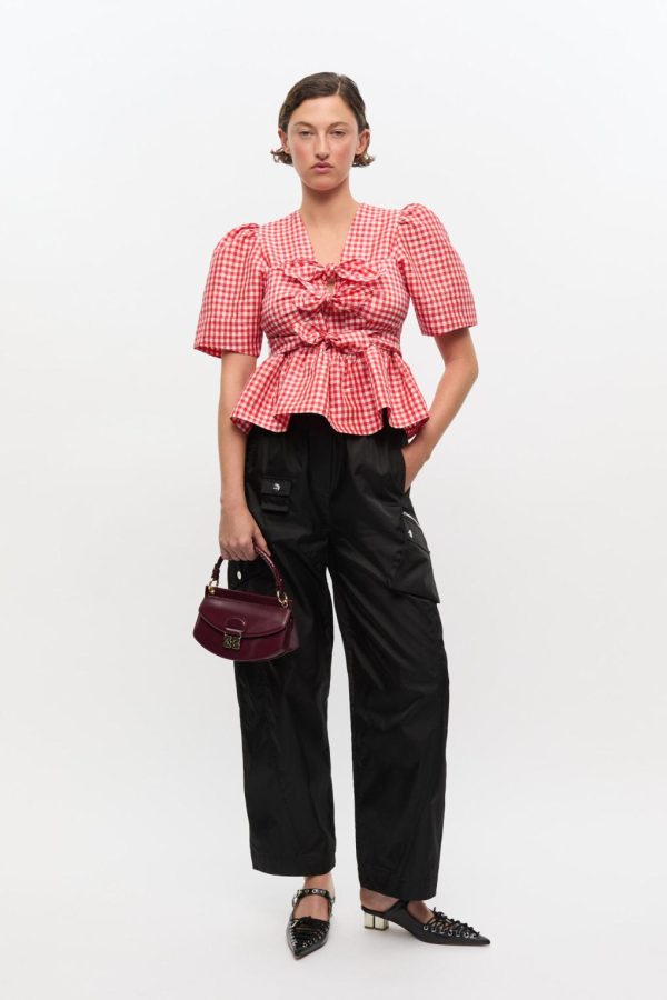This bag features a structured silhouette, a top handle and an adjustable and removable shoulder strap. The bag has a magnetic closure with the signature GANNI Butterfly clasp in gold-tone, a slip pocket and three main compartments.