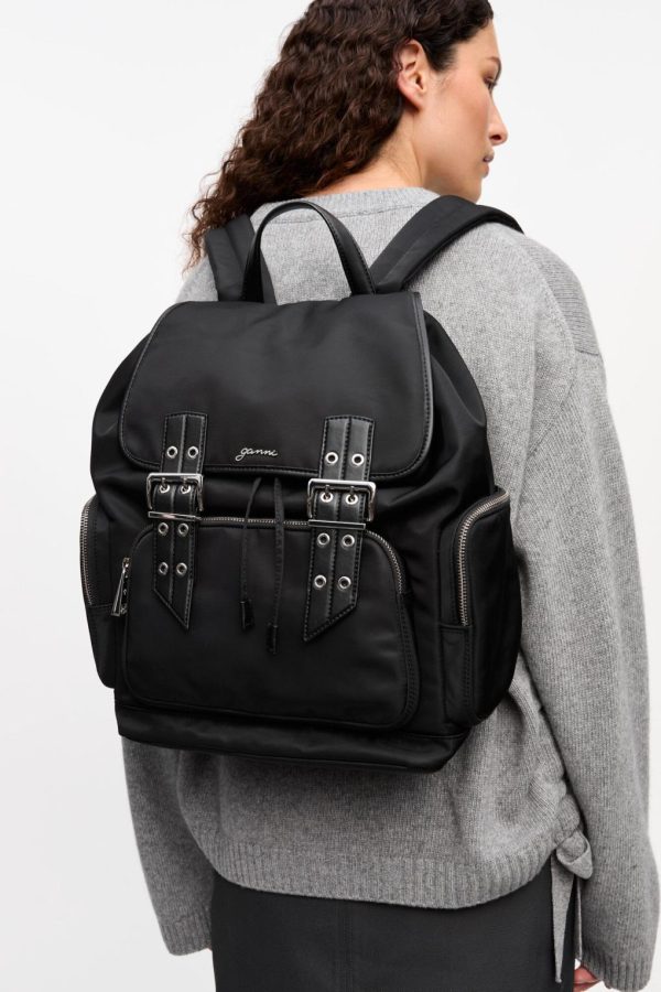 This backpack is made from recycled nylon. The backpack features adjustable and padded shoulder straps, a top handle, front buckle fastenings, a front pocket, two side pockets, a foldover top, a drawstring closure, and a GANNI logo.