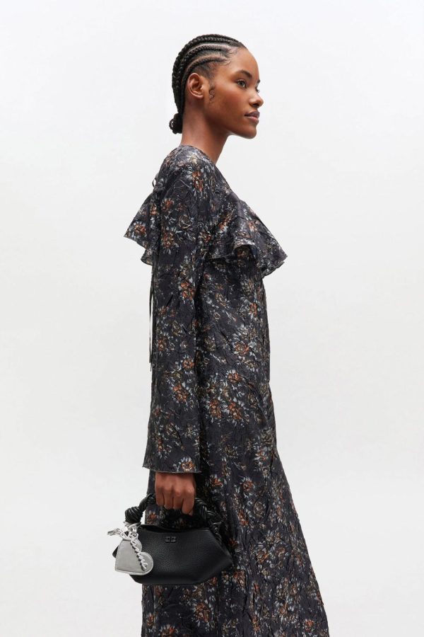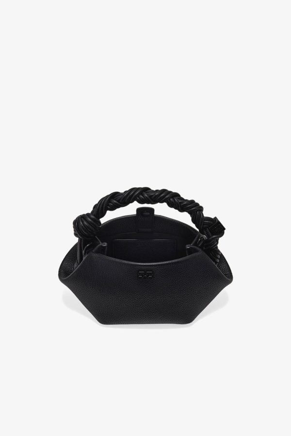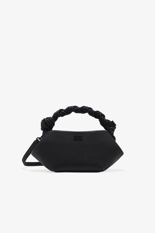 This bag features a tone-on-tone metallic GANNI Butterfly logo, a twisted handle with a braided knot, and a gold-tone metallic dice with a GANNI Butterfly logo engraved. The bag has an internal magnetic closure, a flat card pocket inside, and an adjustable and removable shoulder strap for crossbody wear.