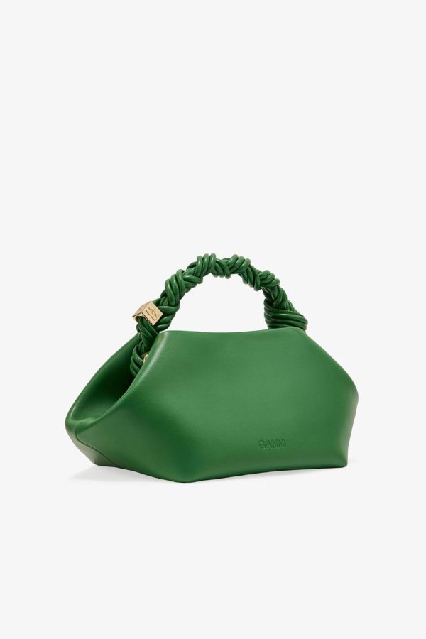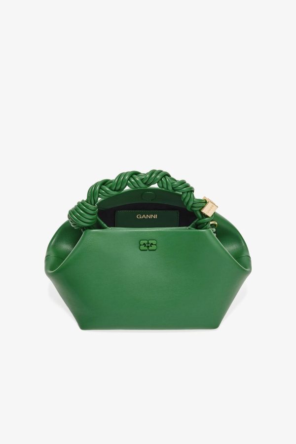 This bag features a tone-on-tone metallic GANNI Butterfly logo, a twisted handle with a braided knot, and a gold-tone metallic dice with a GANNI Butterfly logo engraved. The bag has an internal magnetic closure, a flat card pocket inside, and an adjustable and removable shoulder strap for crossbody wear.