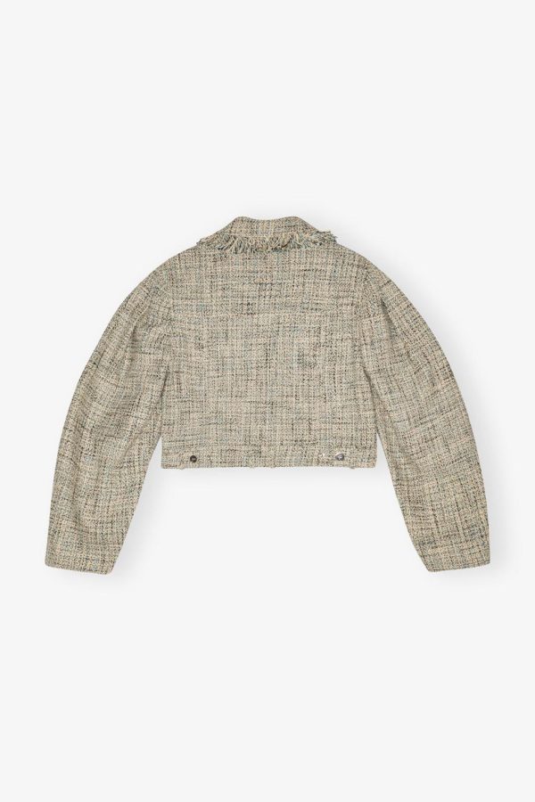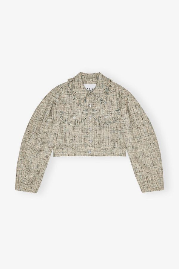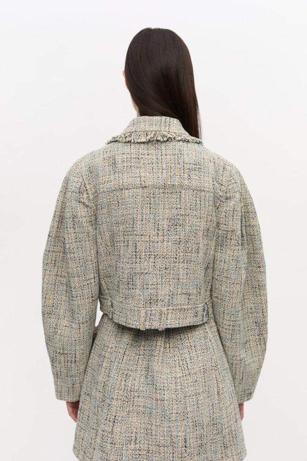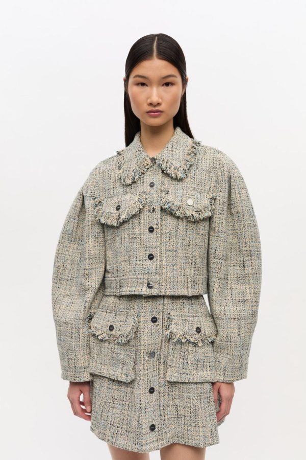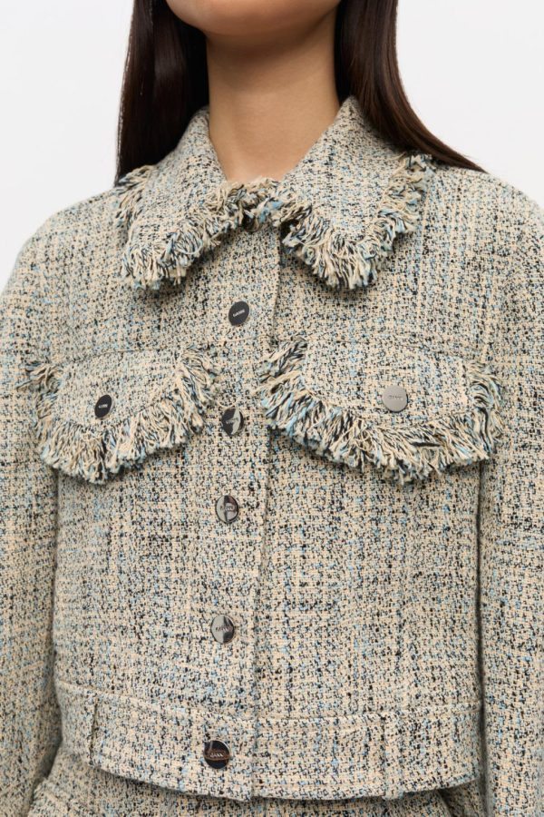 This jacket features a cropped silhouette with a button-up front. The design includes a classic collar, chest pockets and fringe detailing.