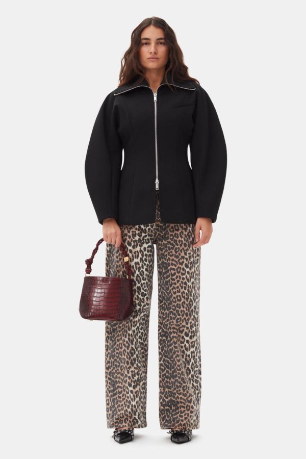 This Black Bonded Crepe Curve Sleeve Jacket features a full front zipper closure with a silver zipper, a high collar that can be worn up or folded down and a slit pocket on the chest.