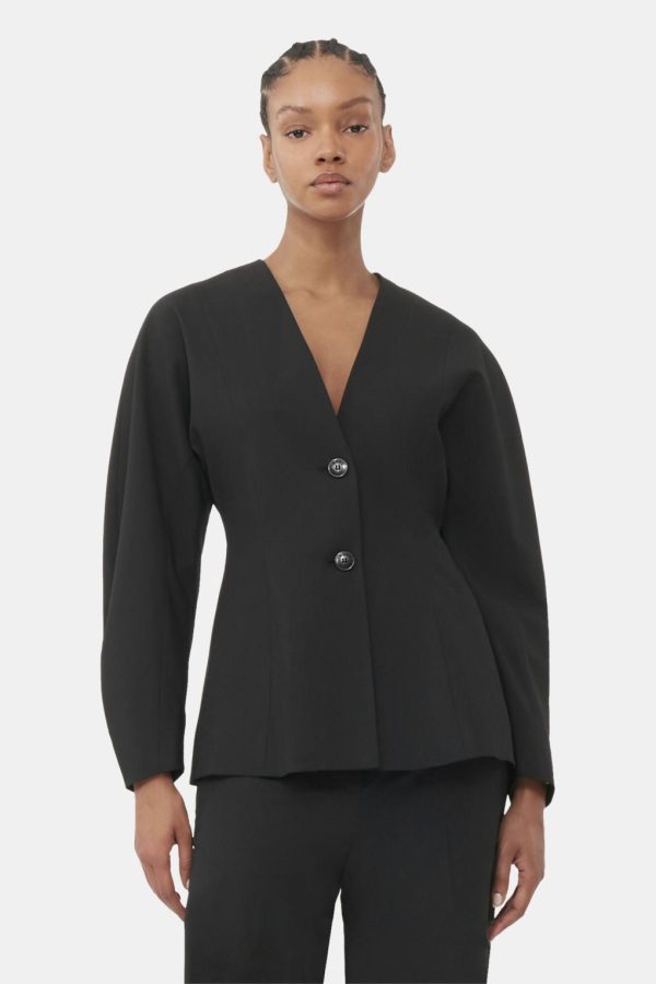 This Black Fitted Drapey Melange Blazer is made from a blend of LENZING™ ECOVERO™ viscose. The blazer is designed for a regular fit and features a V-neckline, button closure and shaped sleeves.