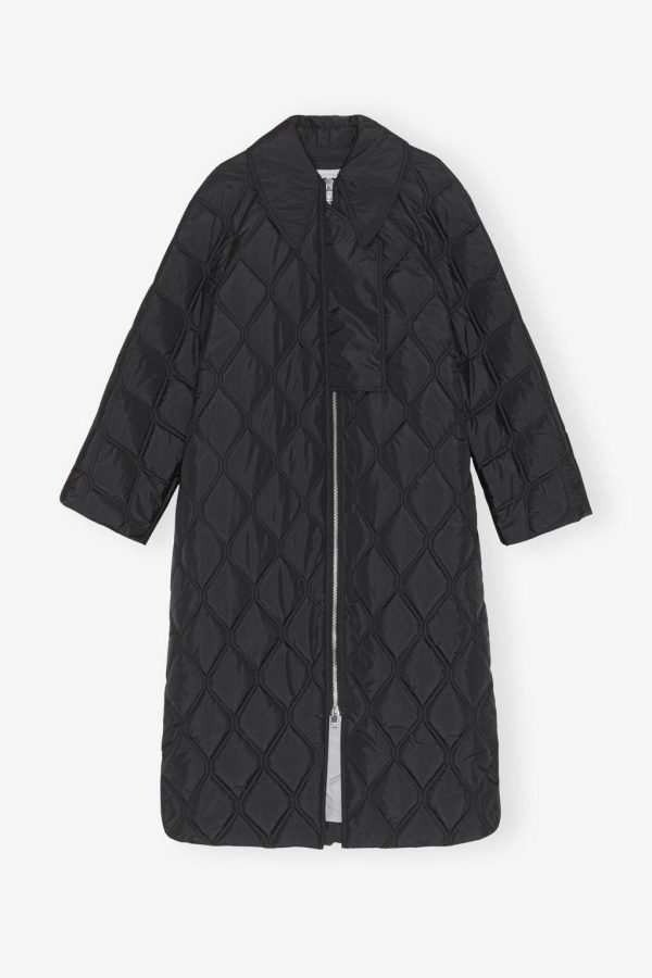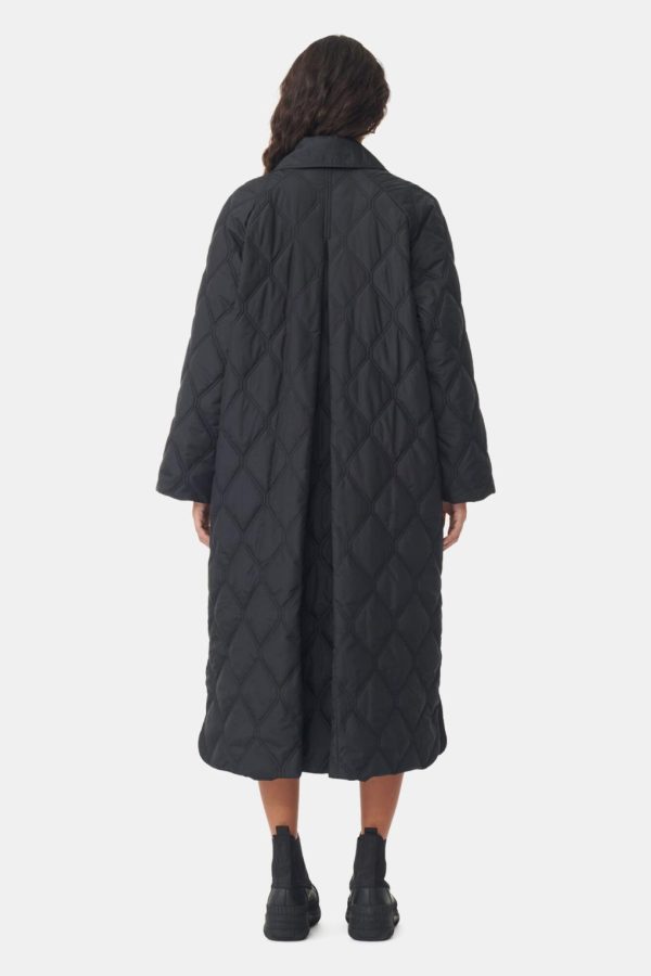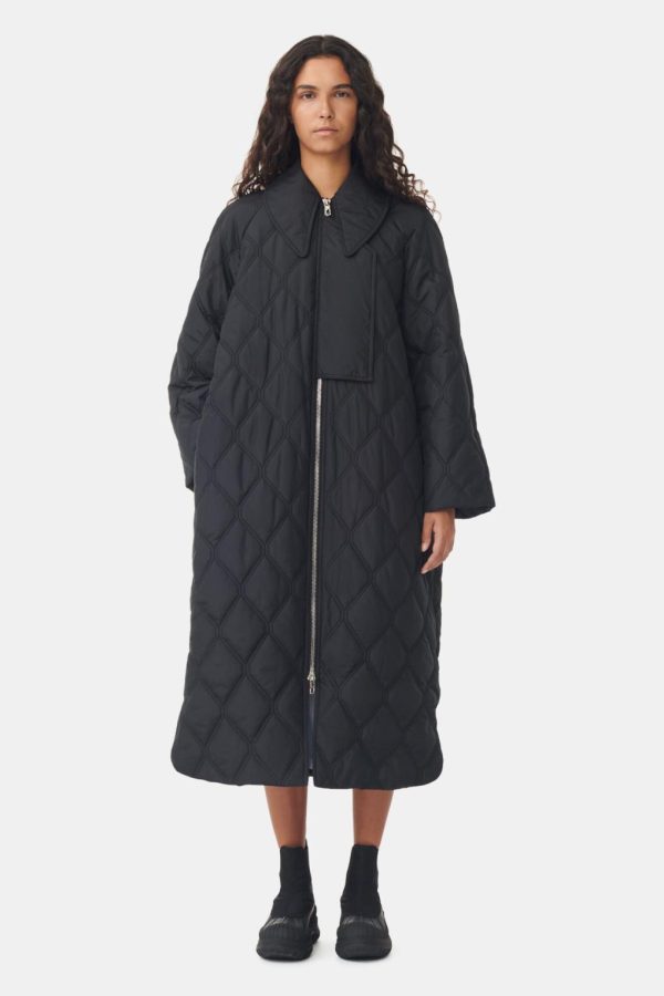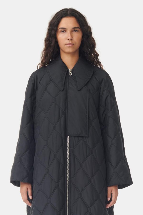 This Ripstop Quilt Coat is made from recycled polyester. The jacket is designed for a relaxed fit and features a collar, heavy zip closure, asymmetrical button closure, side pockets, curved side seams and a box pleat at the back.