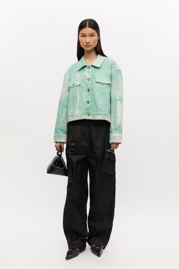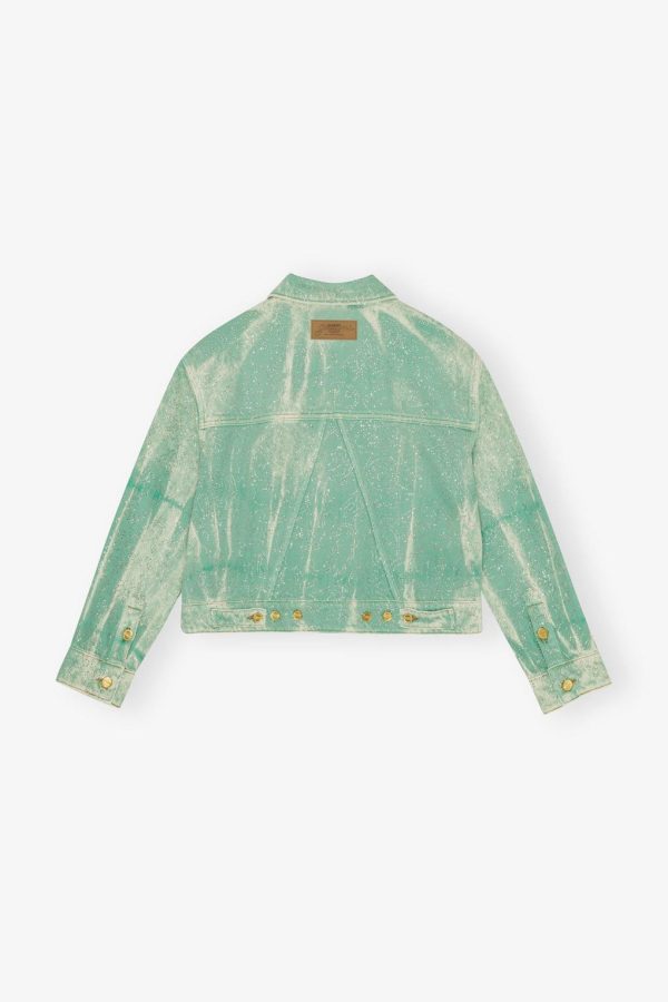 This denim jacket features a green wash with rhinestone detailing, a classic collar, button front closure, and 2 chest pockets.