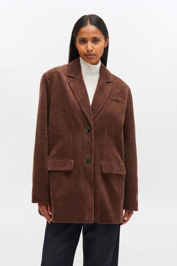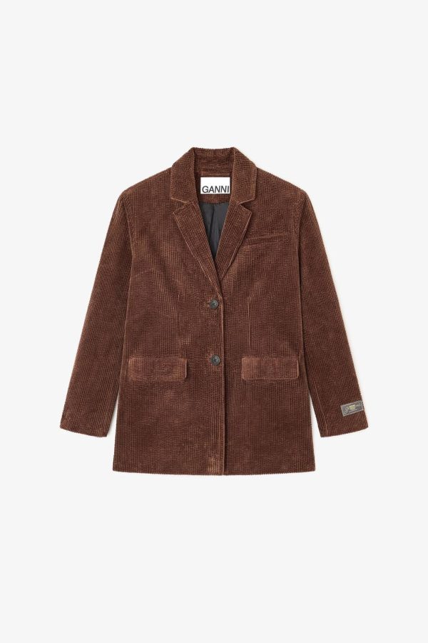 This blazer features a collar, button-front closure, 3 pockets and a GANNI logo patch at the sleeve hem.
