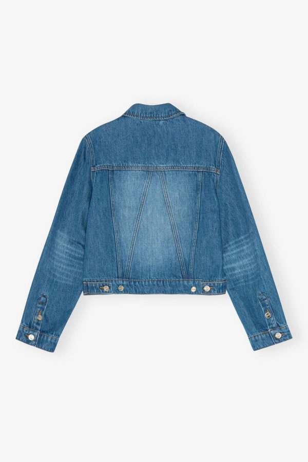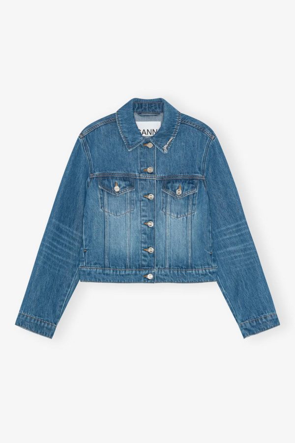 This denim jacket features a classic button-up front with metallic buttons and a pointed collar.