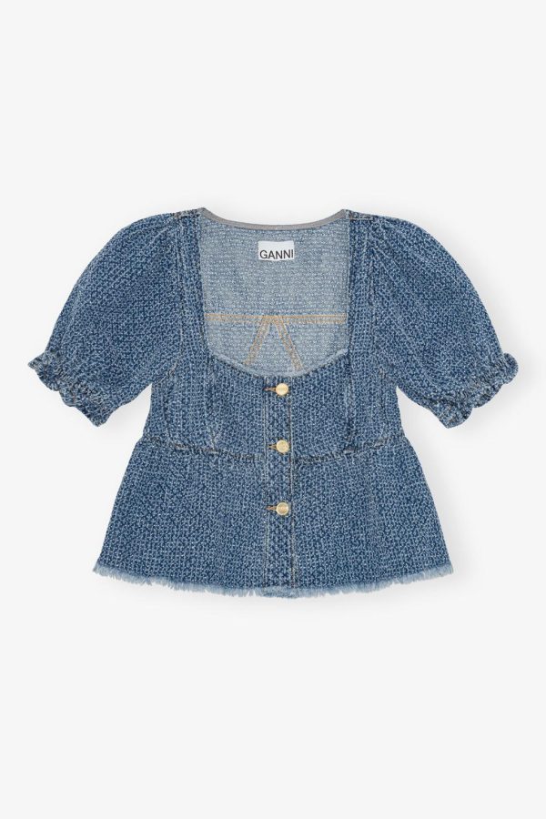 This top in textured denim feature a square neckline neckline, button front closure, short sleeves with ruching and a ripped hem.