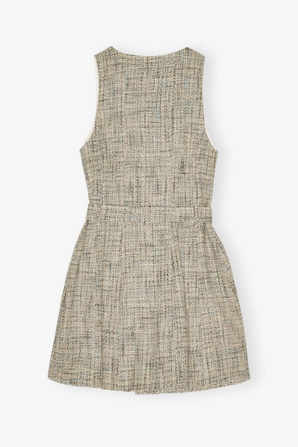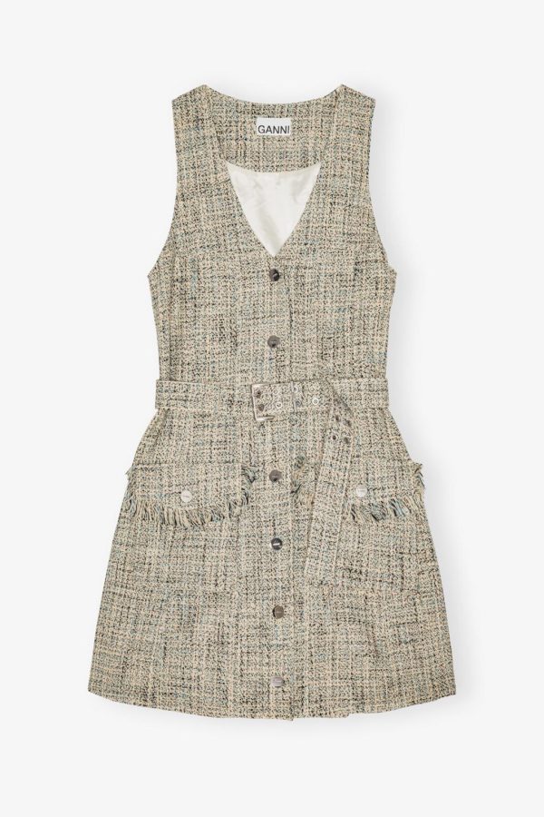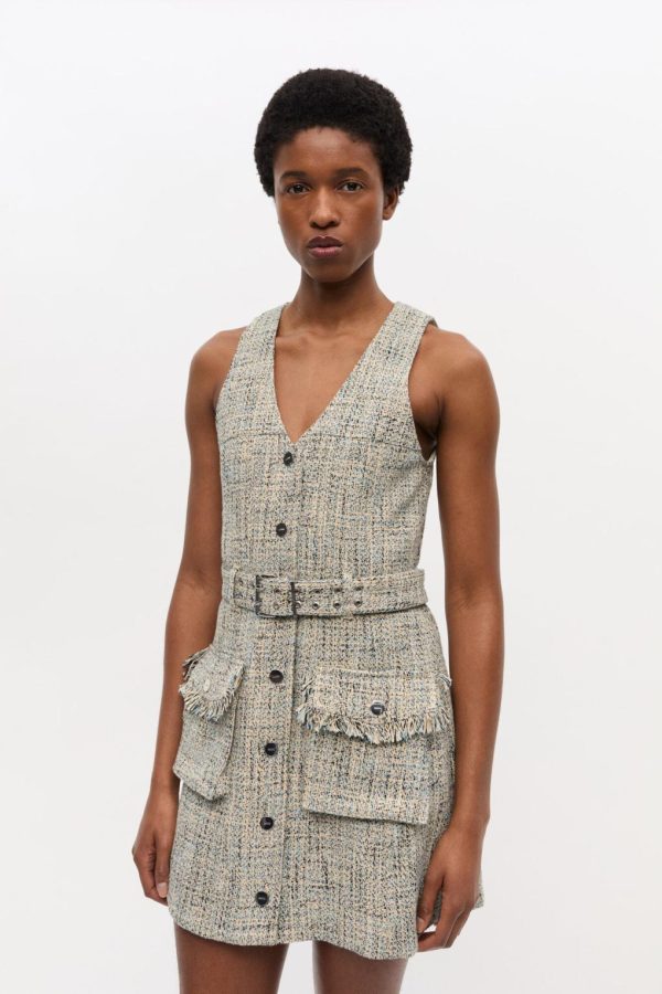 This dress is crafted from a textured tweed fabric and features a sleeveless design with a V-neckline. The dress has a button closure down the front and a matching belt with a metallic buckle. The dress is detailed with two front pockets adorned with fringe.
