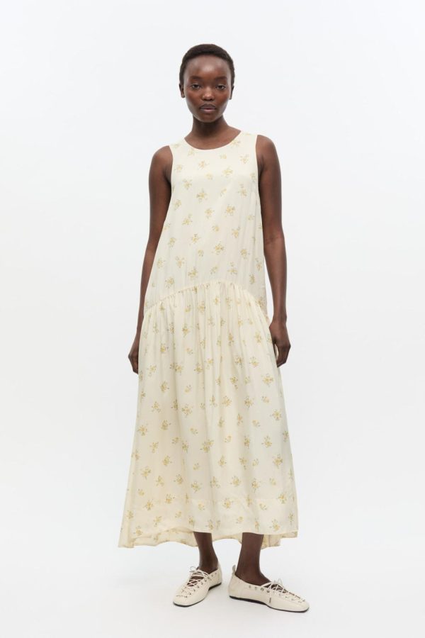 This dress is sleeveless and features a round neckline, tie detail at the back and a dropped waist.