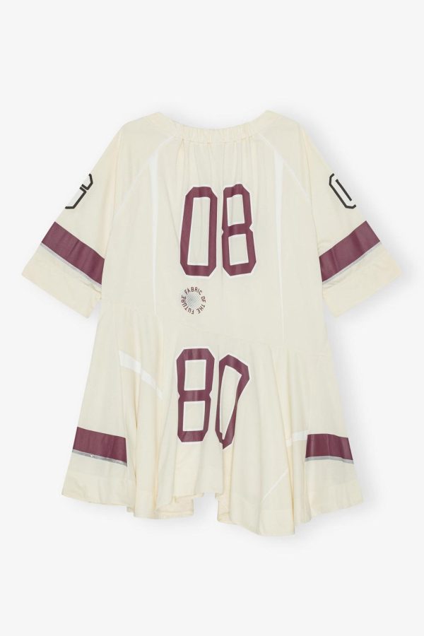 This dress features bold graphics and a relaxed silhouette. It is designed with a V-neckline, contrasting sleeve panels, and a bold ’08’ graphic adorning the back, skirt and sleeves.
