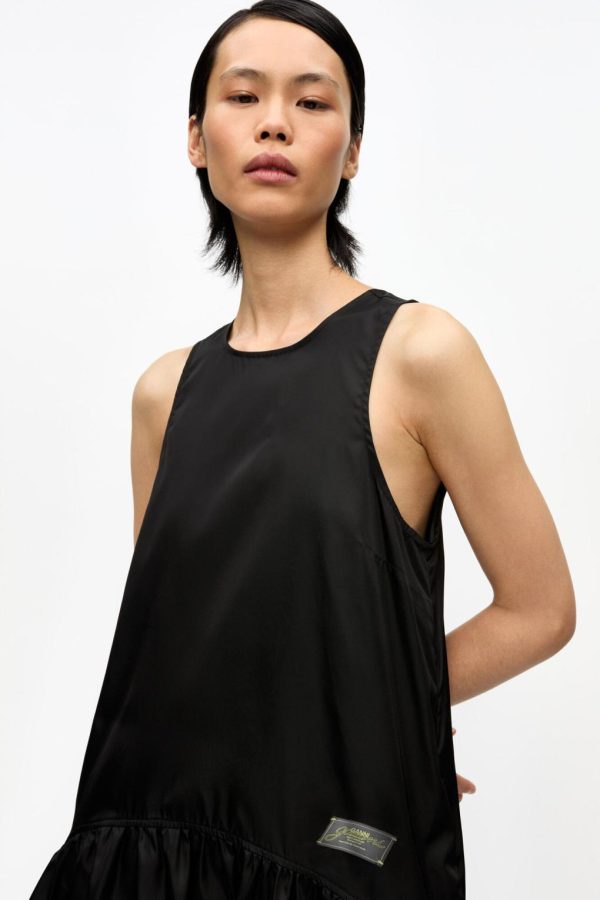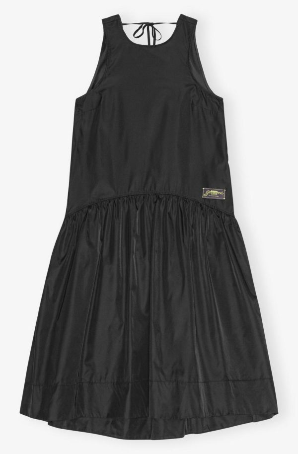 This dress features a round neckline and an open back featuring a tie detail. The dress has an A-line silhouette with a gathered, slightly flared skirt and a GANNI logo patch.