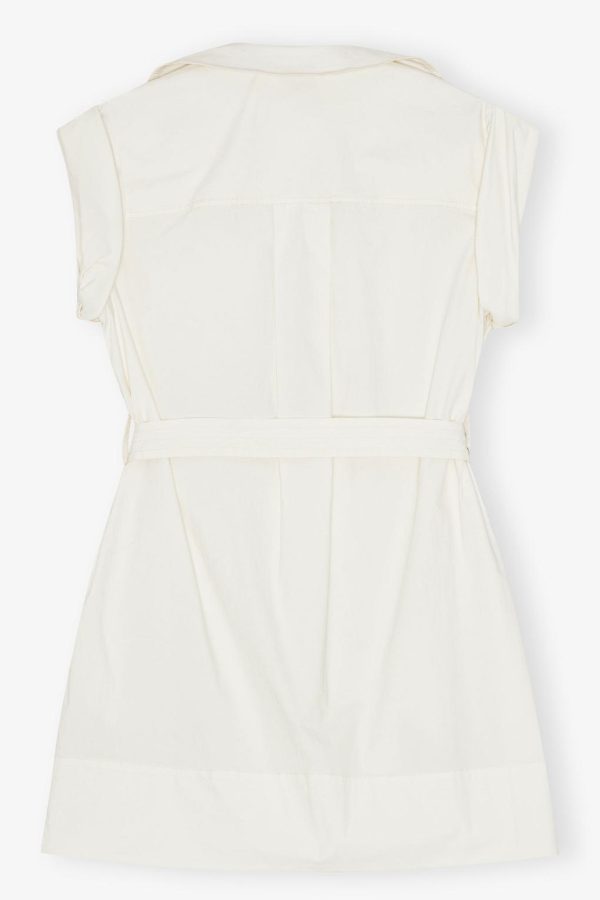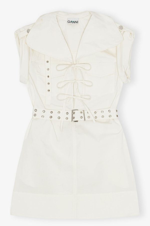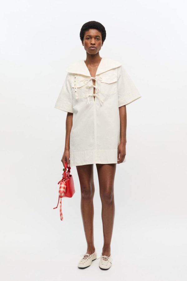 This dress features a deep v-neckline with three ties and a belted waist. The dress has short adjustable sleeves and two front pockets.
