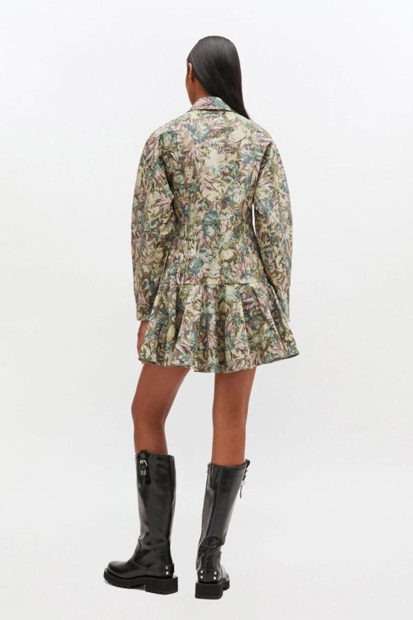 This dress features a tapestry floral print, classic collar, button-front closure, drop waist and ruffled hem detail.