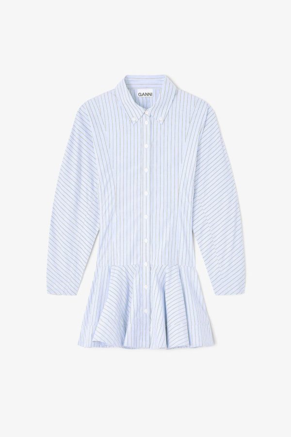 This dress features a stripe print, classic collar, button-front closure, drop waist and ruffled hem detail.