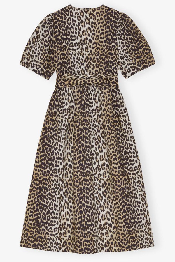 This Leopard Printed Cotton Tie Strap Midi Dress features a deep v-neckline, three tie bands at the front and short sleeves.
