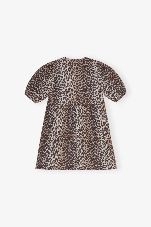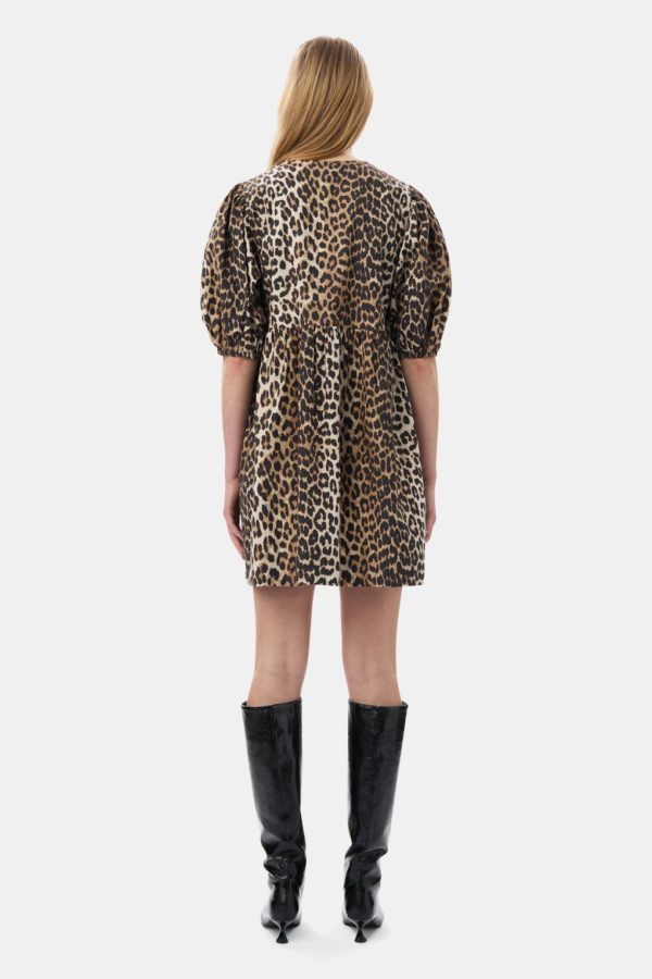 This Leopard Printed Cotton Tie String Mini Dress features an open round neckline with tie closures and puff sleeves with elastic edges.