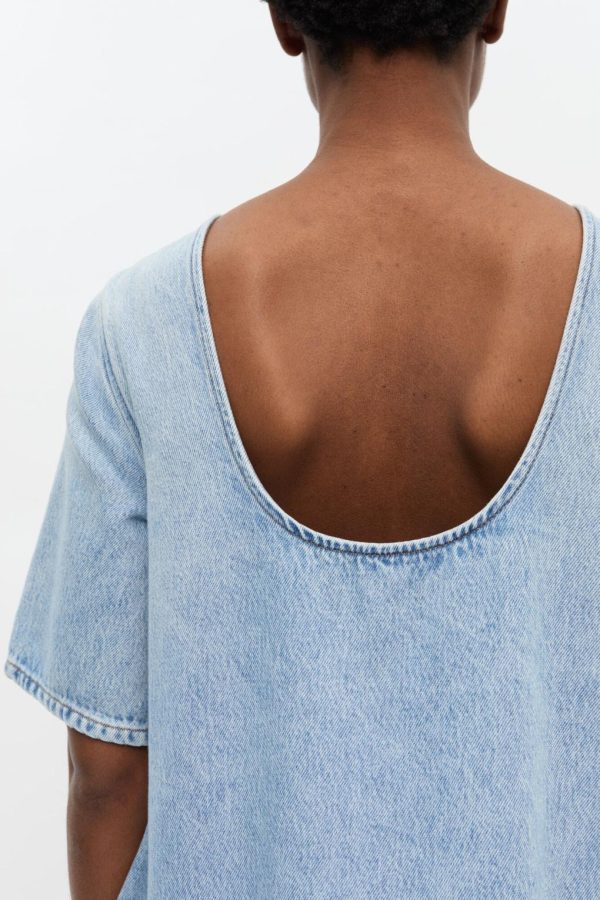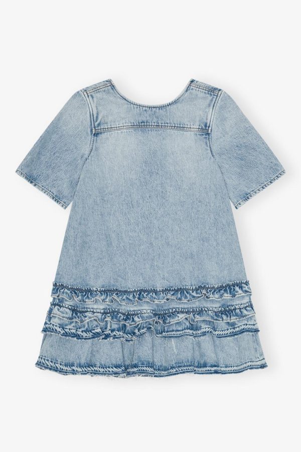 This dress features a round neckline, an open back, short sleeves, frill details and a raw hem.