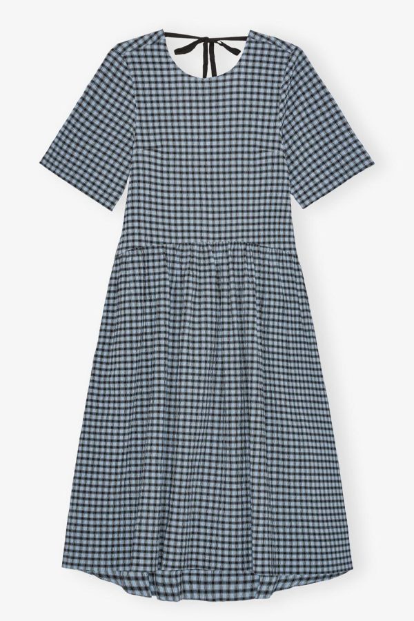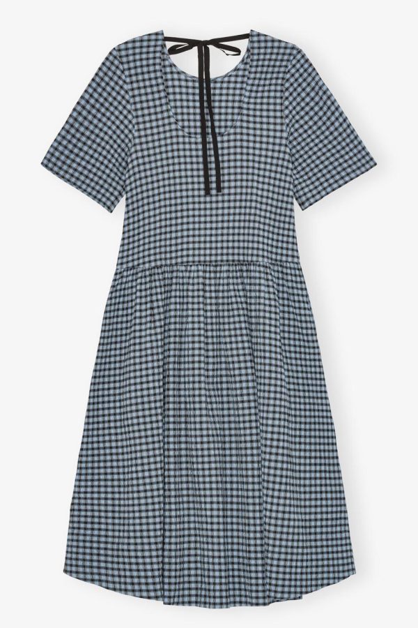This Blue Seersucker Check Midi Dress features a round neckline, short sleeves, tie detail at the back and a dropped waist.