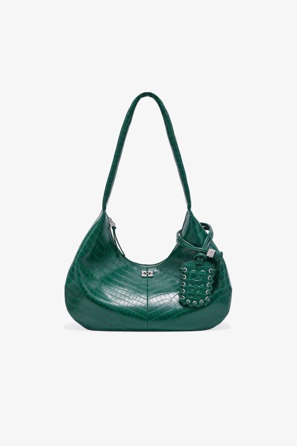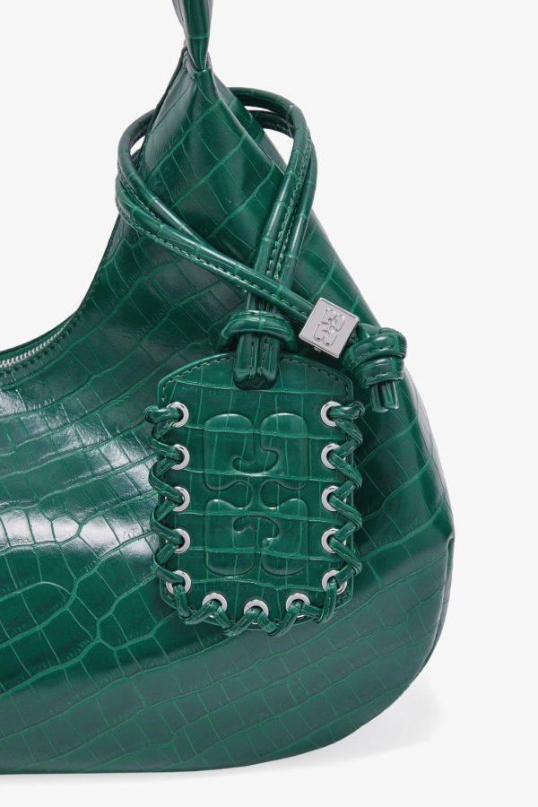 The bag is crafted in recycled leather with a croco finish featuring a mirror hangtag and logo hardware.