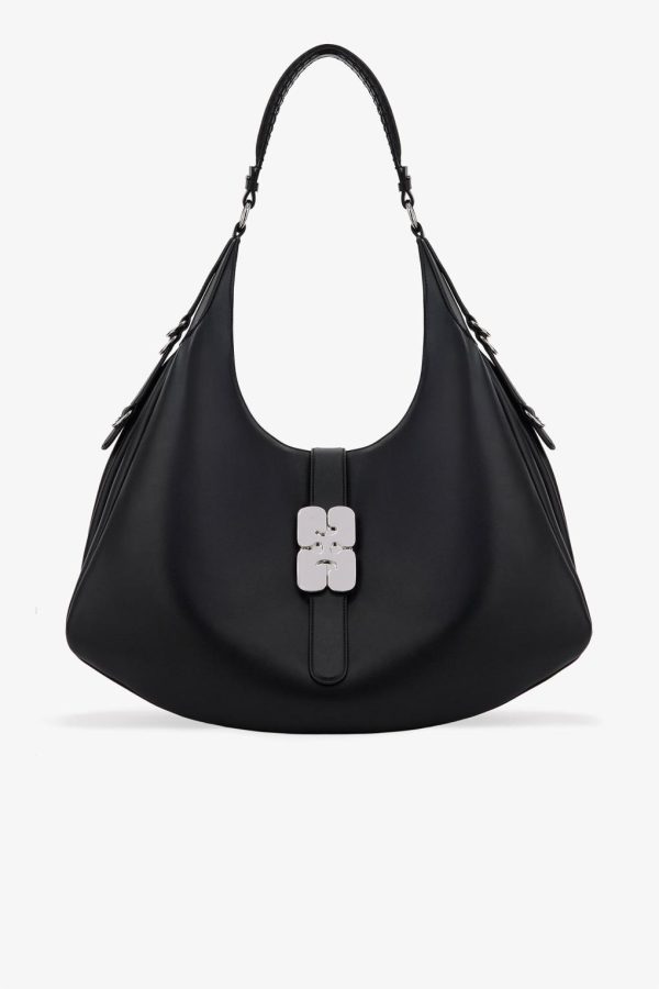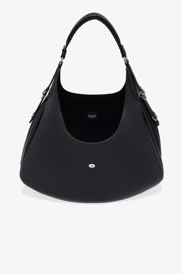 This bag features a accordian-style silhouette, a shoulder strap and D-ring detailing at the side. The bag has a tab closure with the signature GANNI Butterfly clasp in silver-tone, 1 main compartment, an inside open pocket and 1 removable zip pouch.