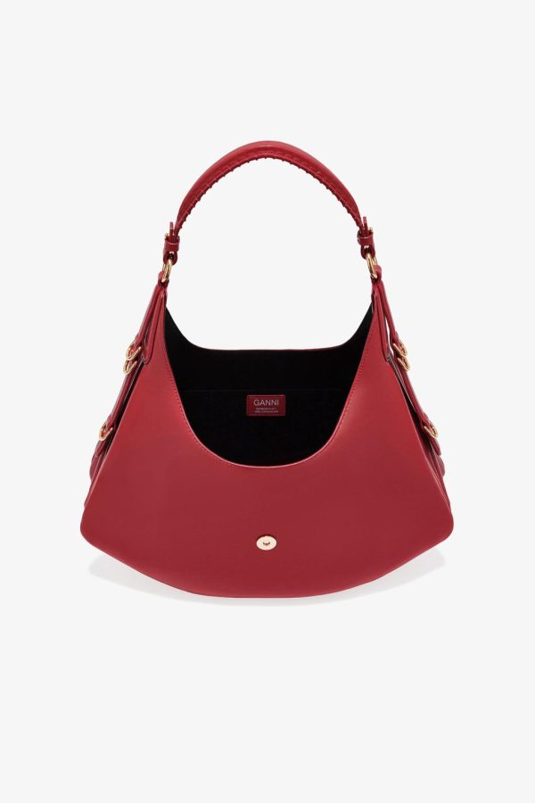 This bag features a accordian-style silhouette, a shoulder strap and D-ring detailing at the side. The bag has a closure tab with the signature GANNI Butterfly clasp in gold-tone, 1 main compartment and an inside open pocket.