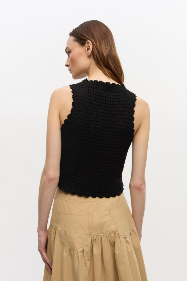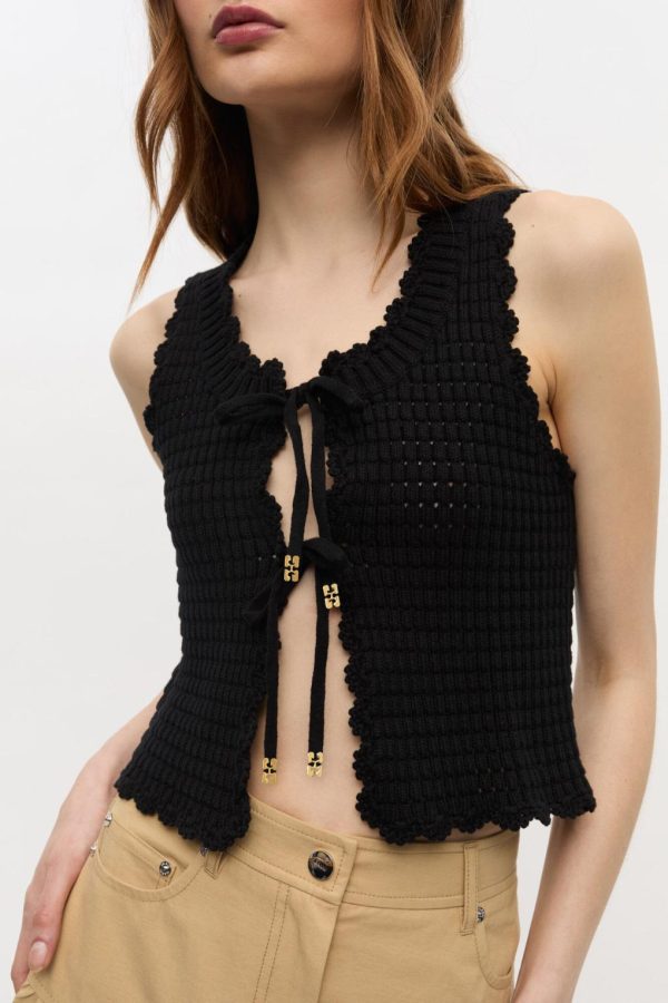 This knitted top features a lace design crafted from organic cotton and cashmere. It has a sleeveless silhouette with a tie closure and gold-tone details.