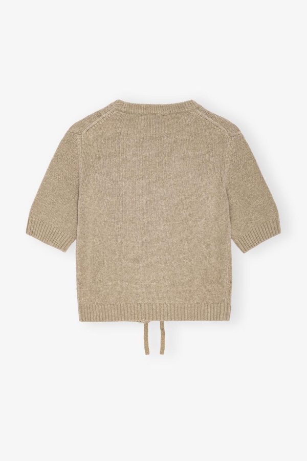 This cardigan features a deep v-neckline, ties at the front, elbow-length sleeves, ribbed edges and a sewn-on GANNI logo patch.