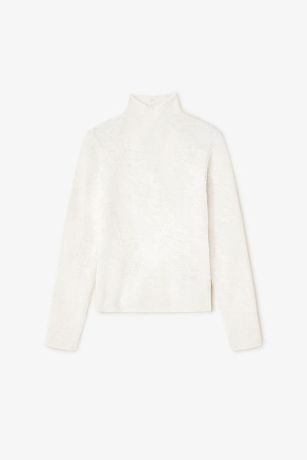 This turtleneck features a sheer flower print, high collar and long sleeves.