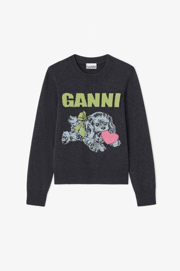 This jumper features a round neckline, long sleeves, ribbed edges, a puppy print graphic and a GANNI logo.
