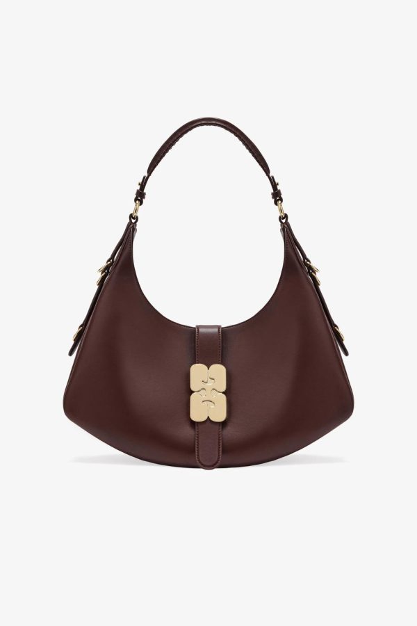 This bag features a accordian-style silhouette, a shoulder strap and D-ring detailing at the side. The bag has a closure tab with the signature GANNI Butterfly clasp in gold-tone, 1 main compartment and an inside open pocket.