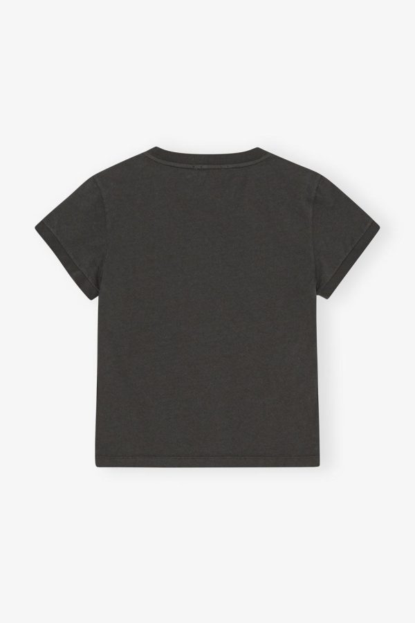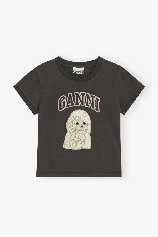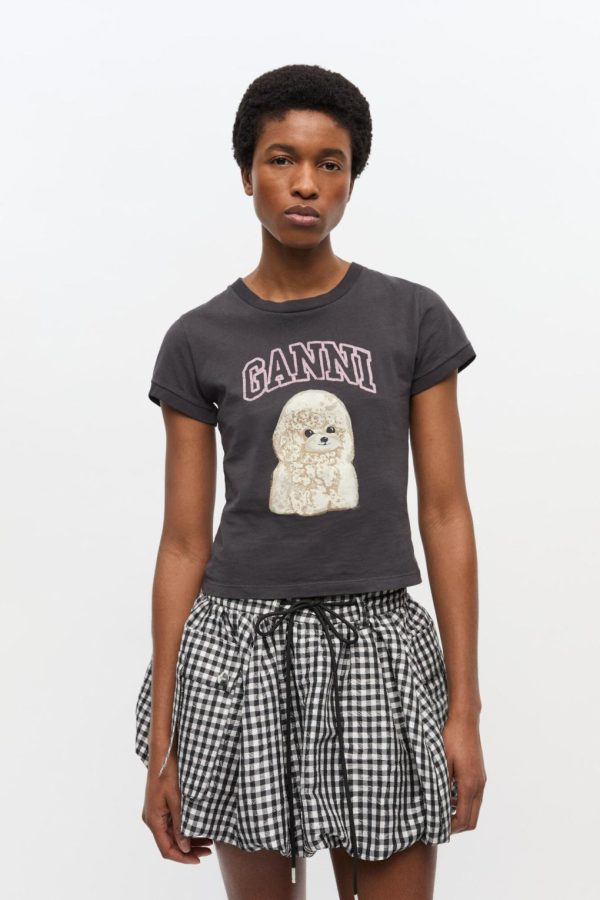 This T-shirt features a round neckline, cropped length, short sleeves, and a GANNI logo. It has a poodle graphic print on the front and a ‘Have a nice day! Please recycle’ message.