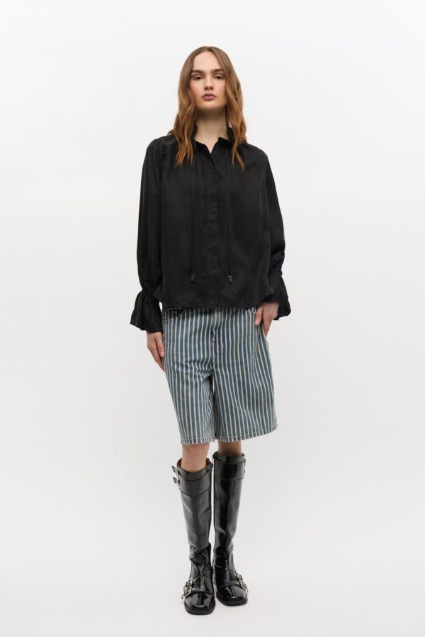 This shirt features a high neckline and a tie string design with silver-tone GANNI Butterfly logo details. The shirt has voluminous sleeves and cuff details.