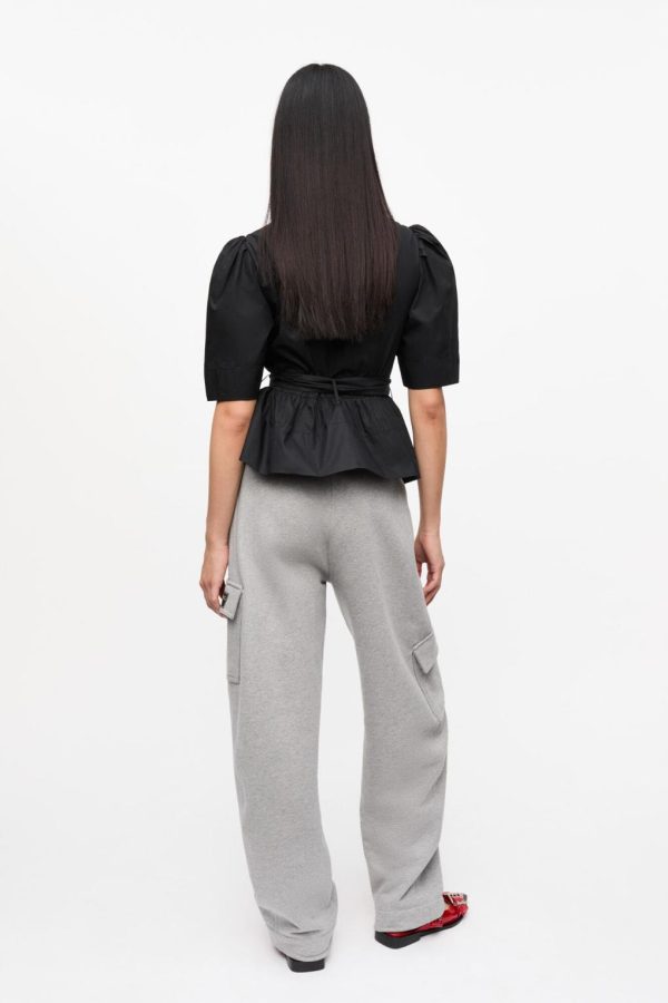 This Black Stretch Cotton Tie Strap Blouse features a deep v-neckline, three tie bands at the front and short, puffed sleeves.