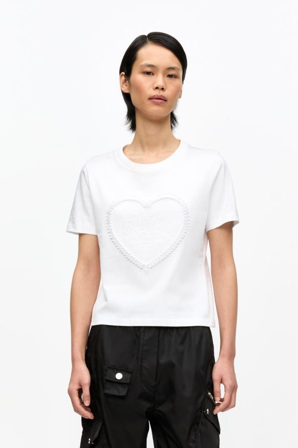 This White Heavy Cotton Heart T-Shirt features a round neckline, short sleeves, an embroidered heart with a GANNI logo and the phrase ‘Have a nice day! Please recycle.’