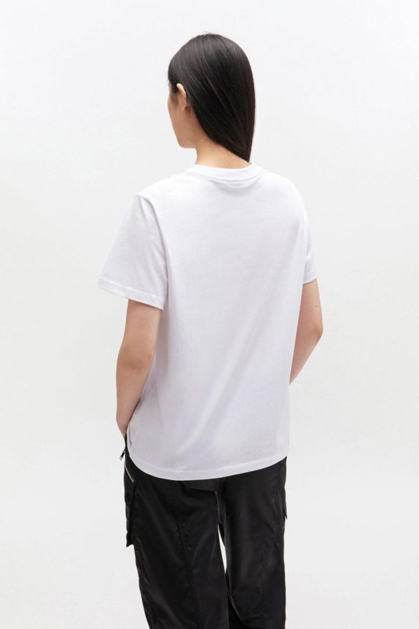 This T-shirt features a round neckline, short sleeves, and a GANNI logo. The T-shirt has a kitty print graphic and a ‘Have a nice day! Please recycle’ message.