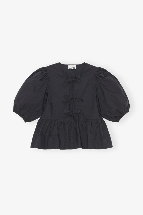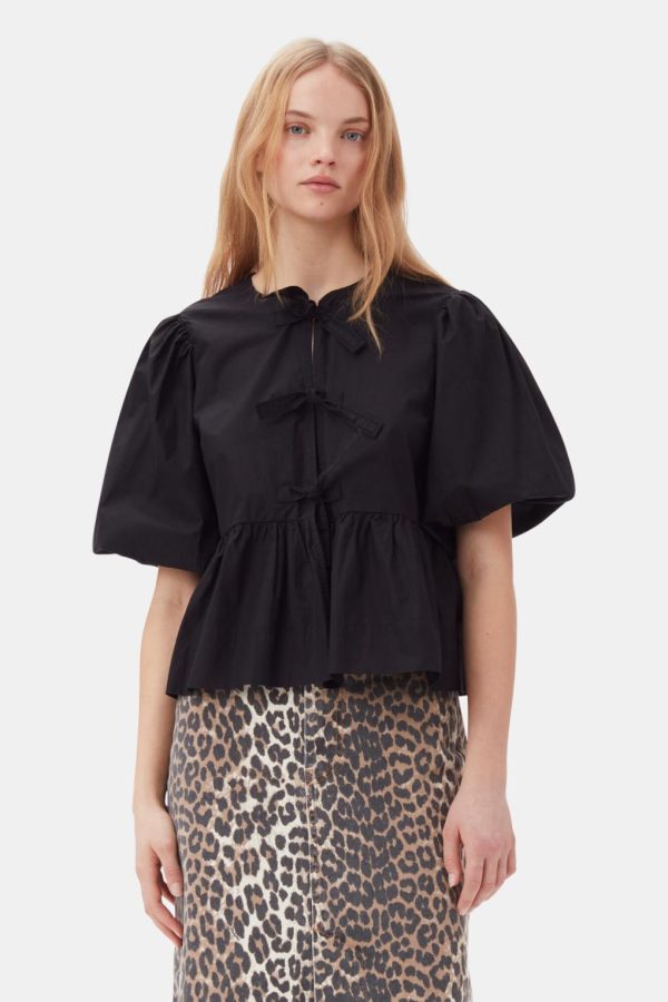 This blouse features an open round neckline with tie bands, puff sleeves with elastic edges and a peplum hem.