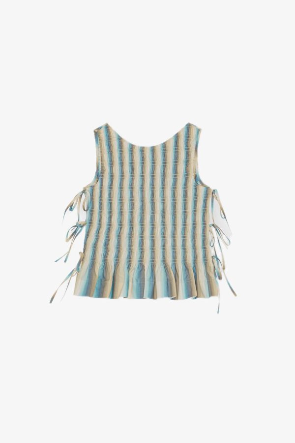 This top is sleeveless and features a smocked texture, tie details along the sides, a scoop back and a ruffled hem.