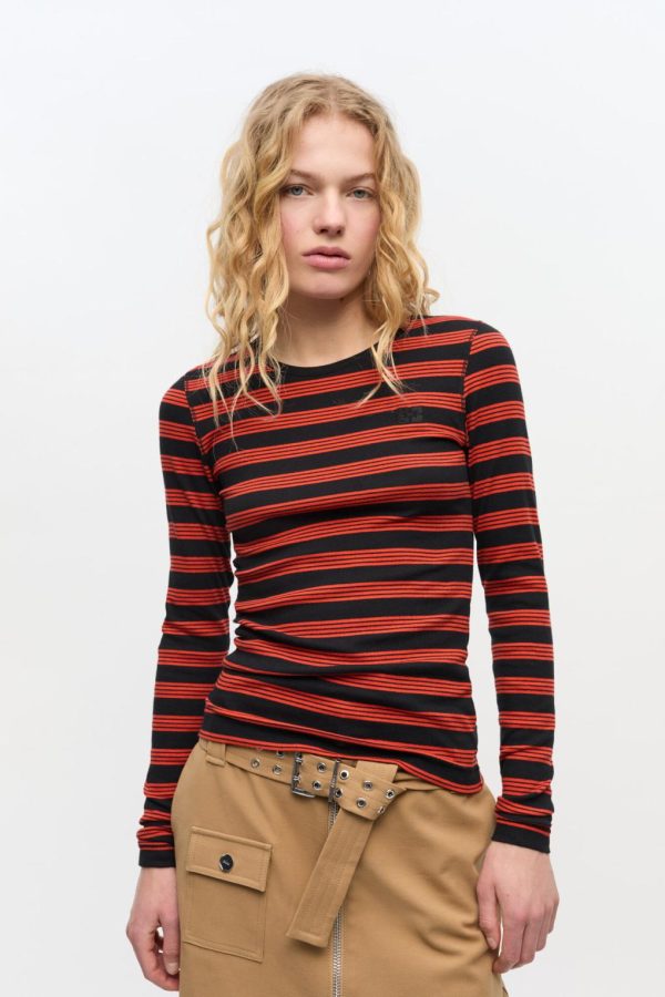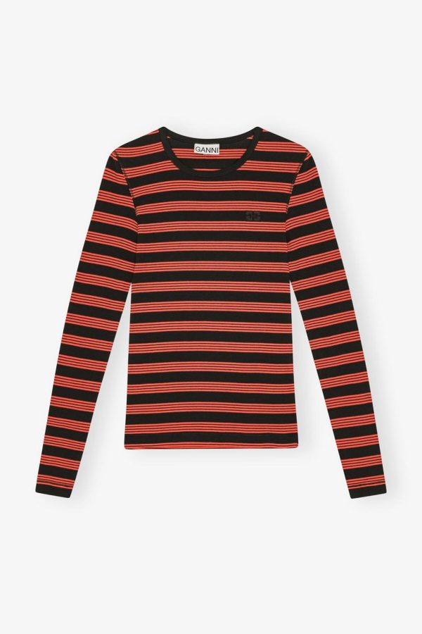 This T-shirt features a red and black striped pattern, s a round neckline, long sleeves, and a GANNI Butterfly logo on the chest.
