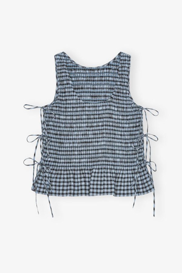 This Blue Seersucker Check Smock Tie String Top is sleeveless and features a round neckline, smock bodice, tie details on the side and a ruffle detail.