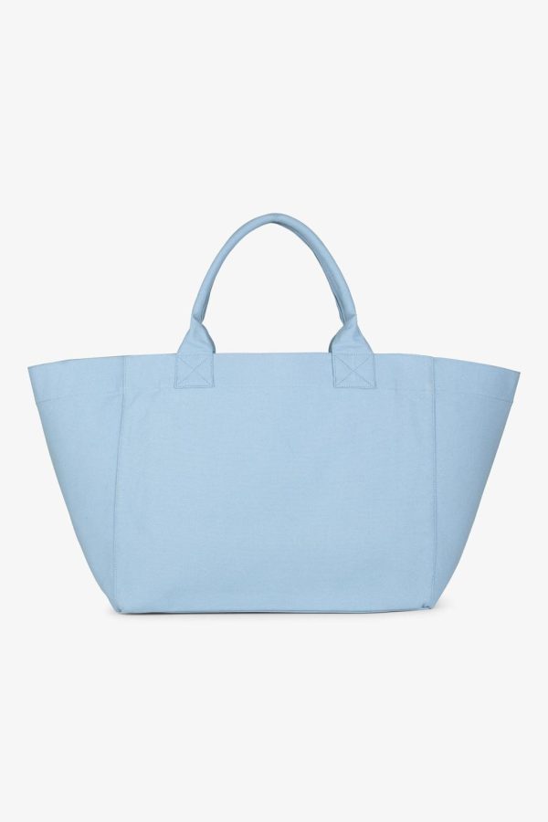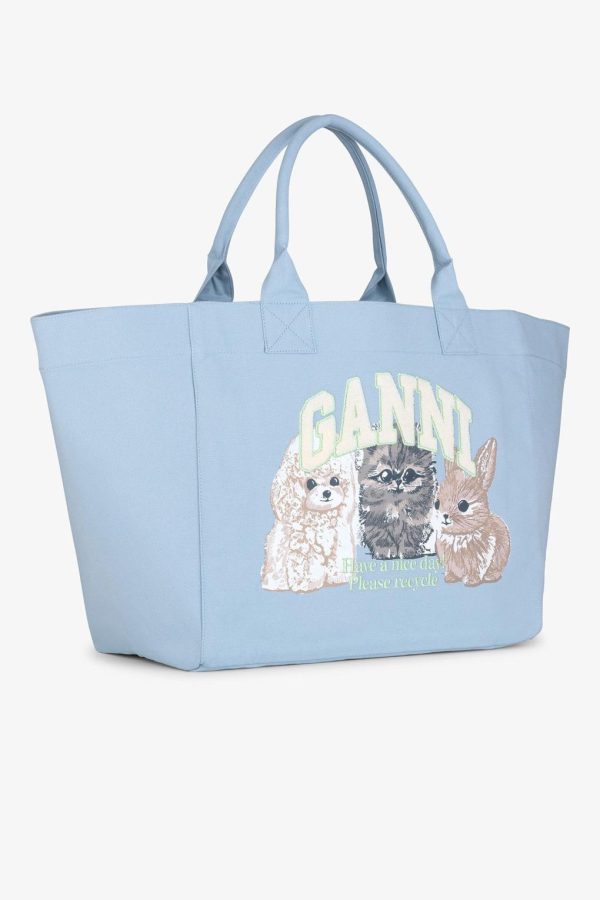 This tote bag is crafted from blue canvas and features top handles, one compartment, a graphic of a dog, cat, and rabbit, and a GANNI logo with the phrase ‘Have a nice day! Please recycle’.