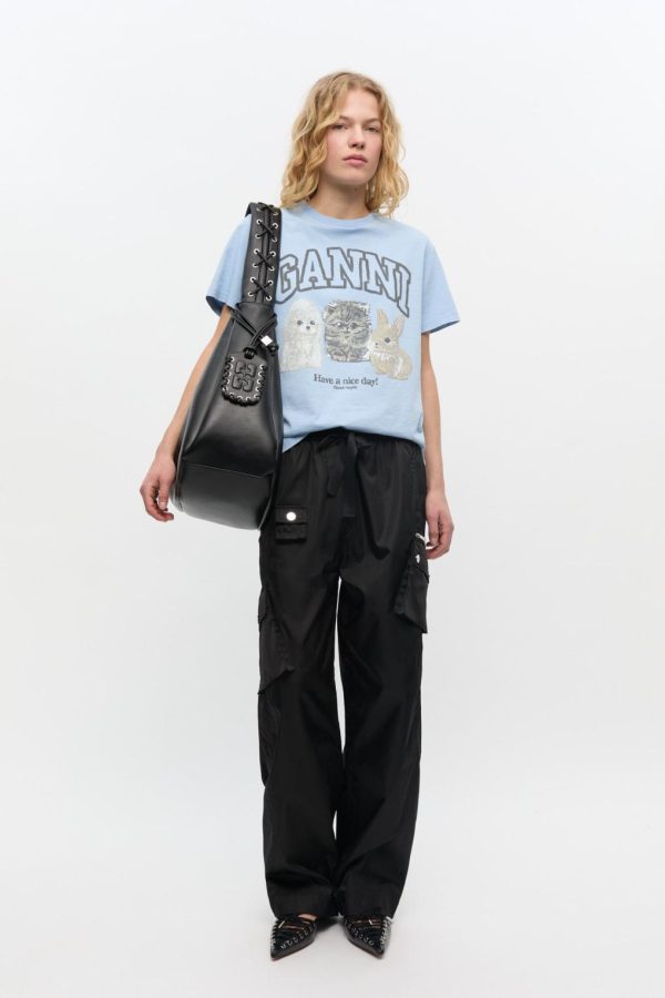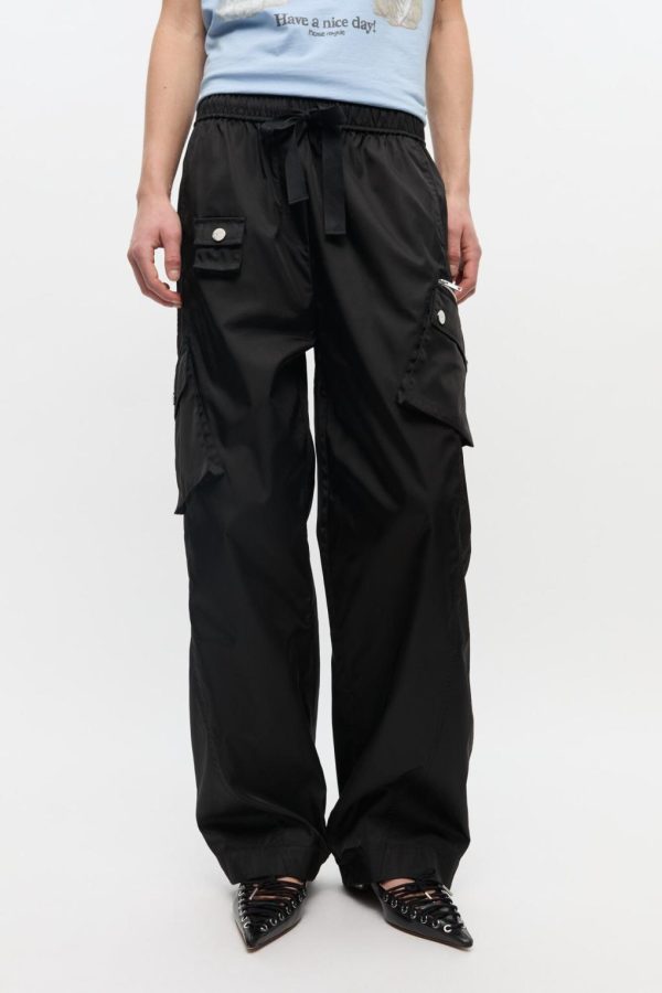 These trousers feature an oversized fit with an elasticated waistband with a drawstring closure. The trousers includes multiple pockets with button and zipper closures.