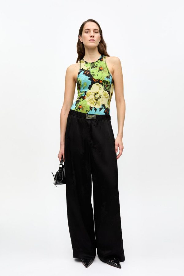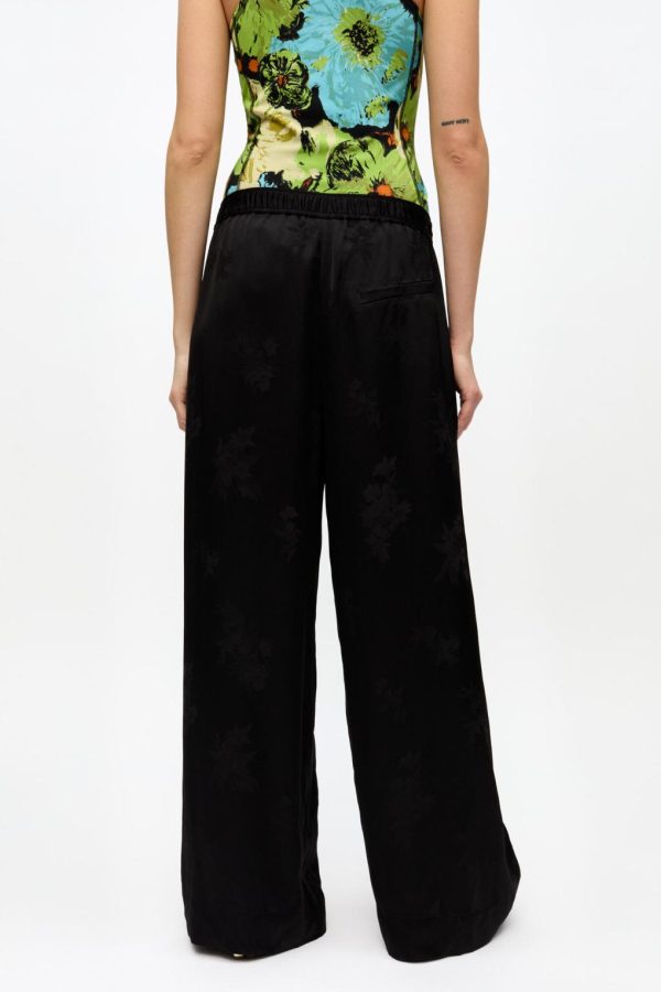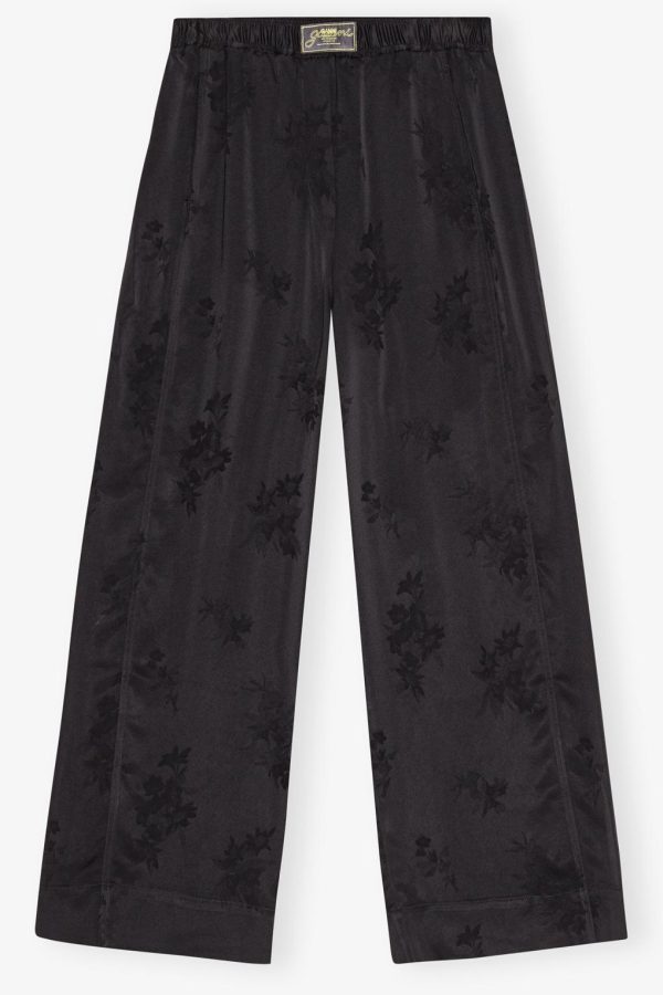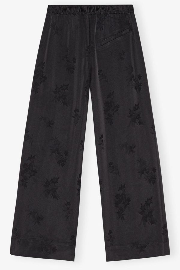 Crafted from a luxurious, soft, flowing fabric with a shiny surface and a delicate jacquard-woven pattern, these Black Satin Jacquard Trousers exude effortless cool. They feature an elasticated waistband, a GANNI label, a decorative back pocket, and relaxed, wide legs.