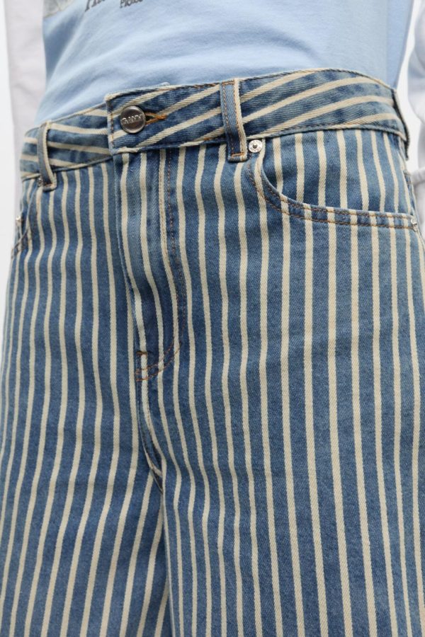 These shorts feature a vertical striped pattern, belt loops, a button closure and a classic five pocket style.
